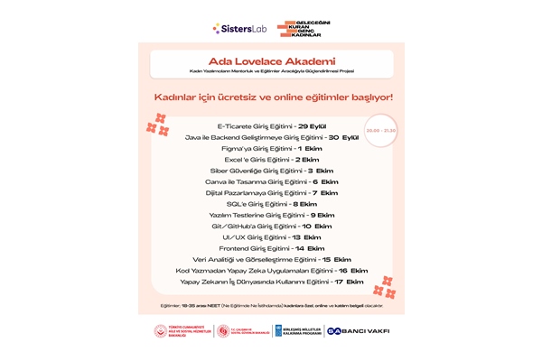 Ada Lovelace Akademi Projesi: Kadın Yazılımcıların Mentorluk ve Eğitimler Aracılığı ile Güçlendirilmesi projesi kapsamında, Sabancı Vakfı‘nın destekleriyle yeni eğitimler için başvurular açıldı! Program, 18-35 yaş arasındaki NEET(Ne Eğitimde Ne İstihdamda olan) kadınların teknik ve destekleyici eğitimler alarak yazılım sektöründe iş gücüne katılımlarını artırmayı hedefliyor.