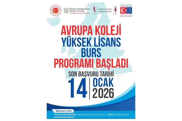 Avrupa Birliği Başkanlığı tarafından, Türk özel sektörü ve sivil toplum kuruluşları, Avrupa Koleji ve Polonya Dışişleri Bakanlığı desteğiyle, akademik açıdan başarılı olan, iyi derecede İngilizce ve Fransızca bilen ve Avrupa Birliği alanında yüksek lisans yapmak isteyen öğrencilere 2026-2027 akademik yılı için Avrupa Koleji’nde (College of Europe) burs imkanı sağlanması öngörülmektedir.