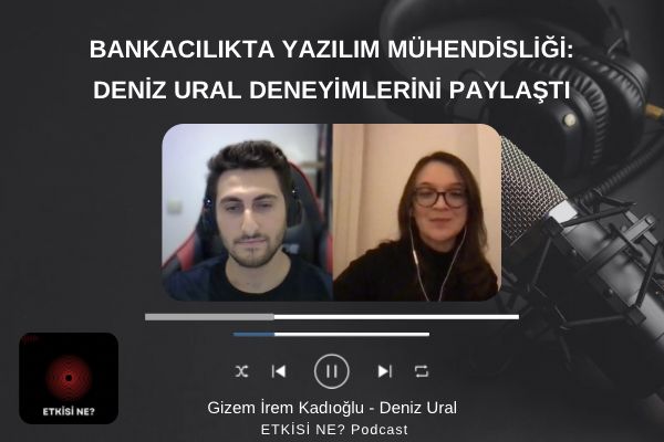 Etkisi Ne? podcast’inin yeni bölümünde Gizem İrem Kadıoğlu, bankacılık sektöründe yazılım mühendisliği deneyimini Deniz Ural ile konuştu. Ural, günlük iş rutininden ekip çalışmasına, kullanılan teknolojilerden yapay zekânın etkisine kadar pek çok başlıkta somut örnekler paylaştı.