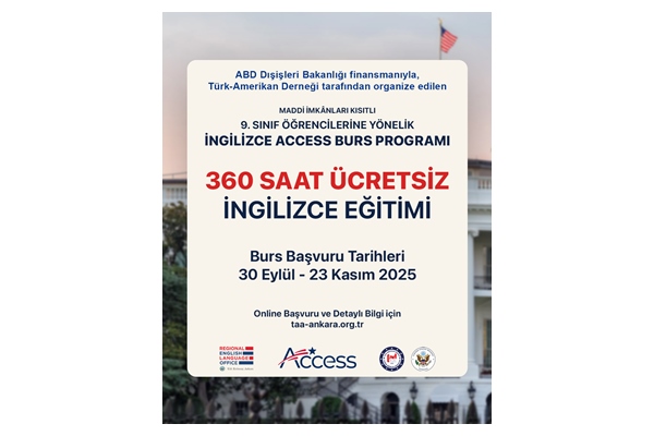 ABD Dışişleri Bakanlığı tarafından finanse edilen ve ABD Ankara Büyükelçiliği tarafından desteklenen İngilizce Access Burs Programı kapsamında, yalnızca 9. Sınıf (Lise 1) öğrencileri arasından seçilecek Ankara’da ikamet eden toplam 30 öğrenciye, Aralık 2025 – Ocak 2027 tarihleri arasında (kitap, kırtasiye ve şehir içi yol masrafları da dâhil olmak üzere) toplam 360 saat ücretsiz İngilizce eğitim bursu verilecektir.